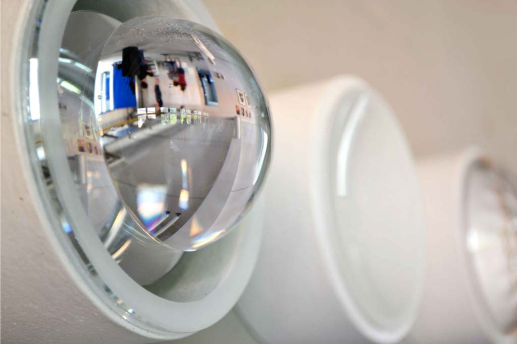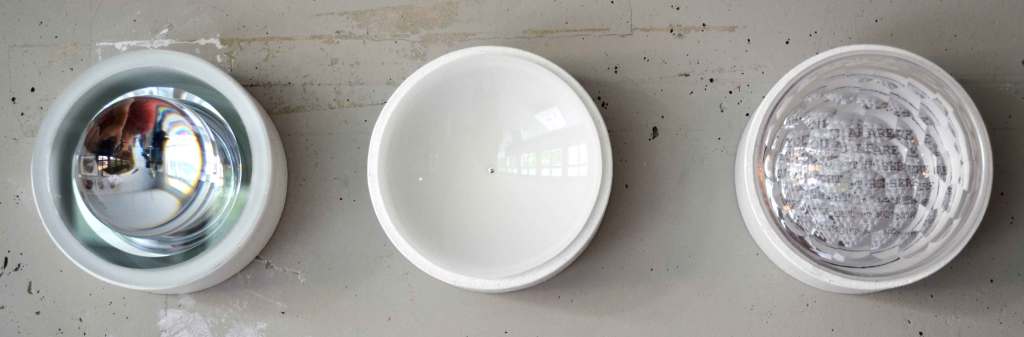 A series of wall objects with reflective components. The observer becomes an active part of the work.