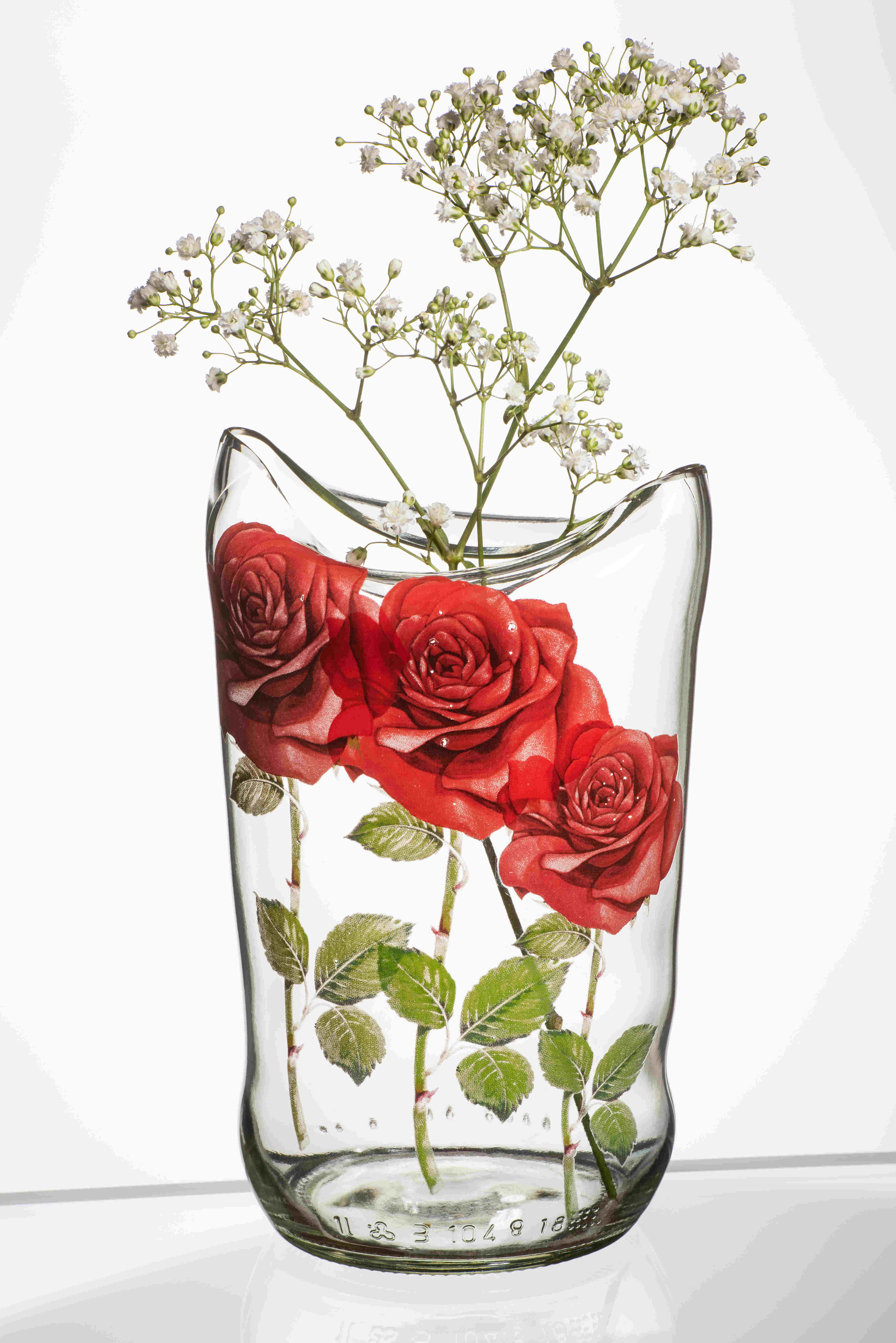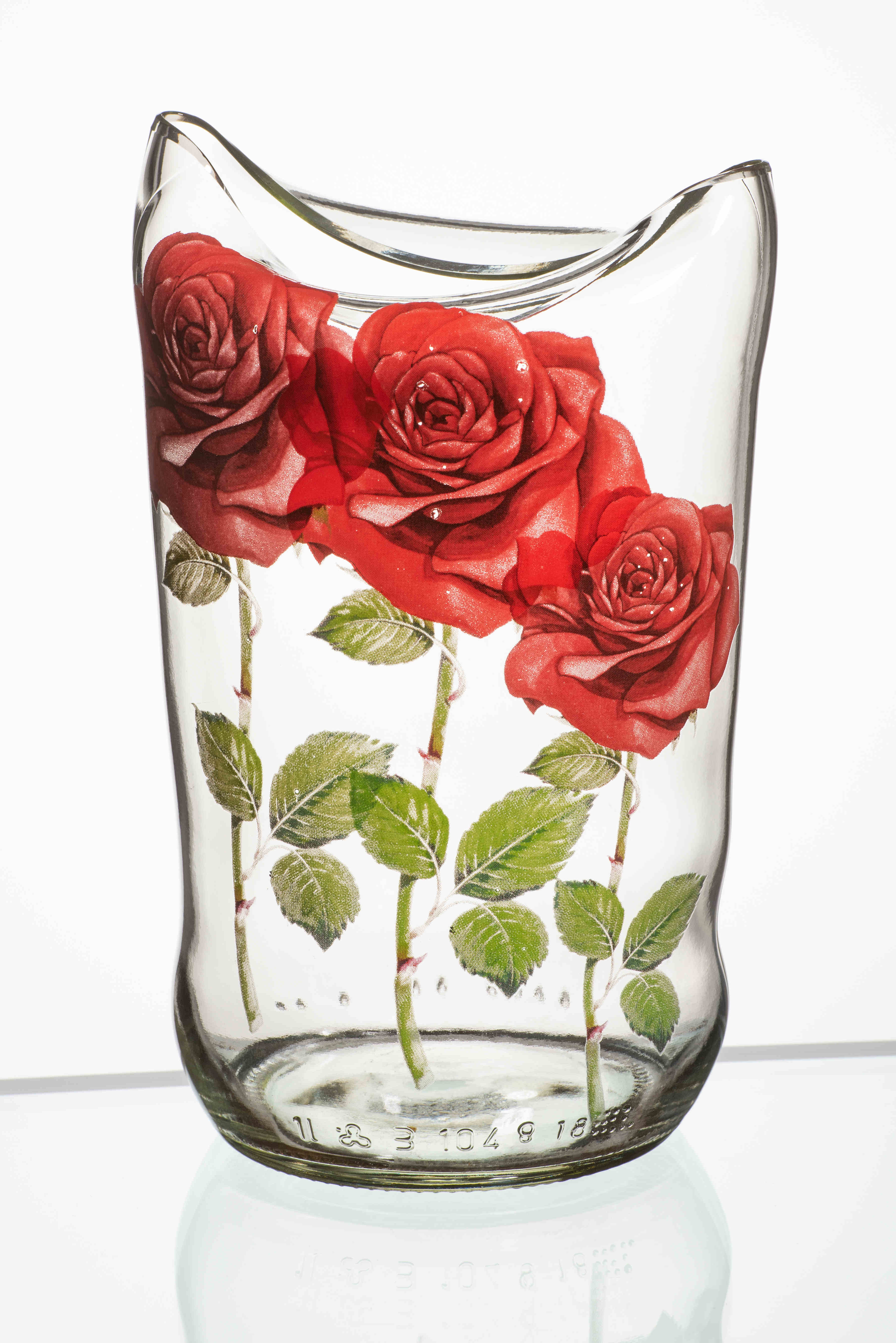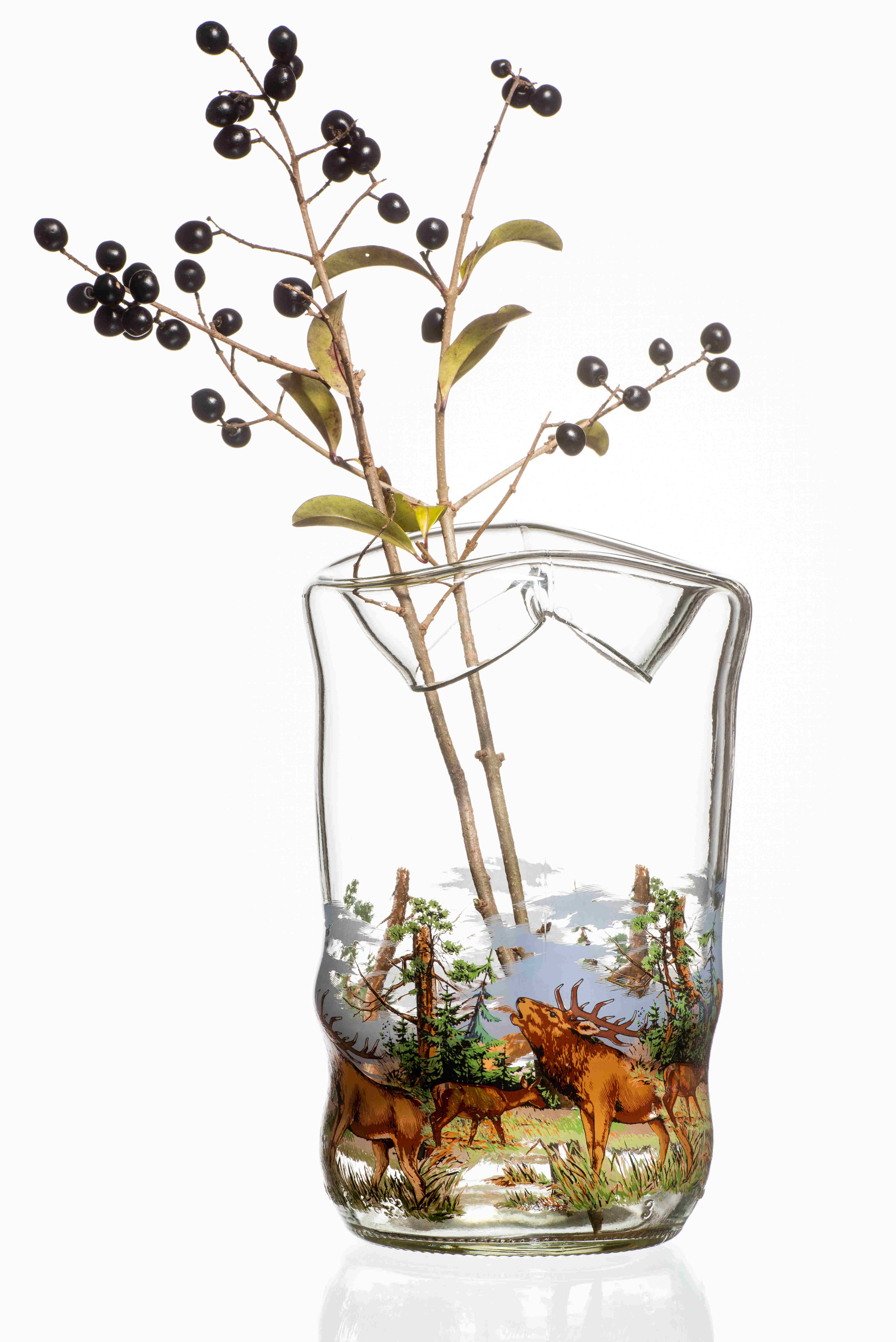 Die Motive werden bei etwa 750° auf die Glasoberfläche eingebrannt, das bringt mit sich, dass sich jedes Glas zum unverwechselbaren Unikat verformt.