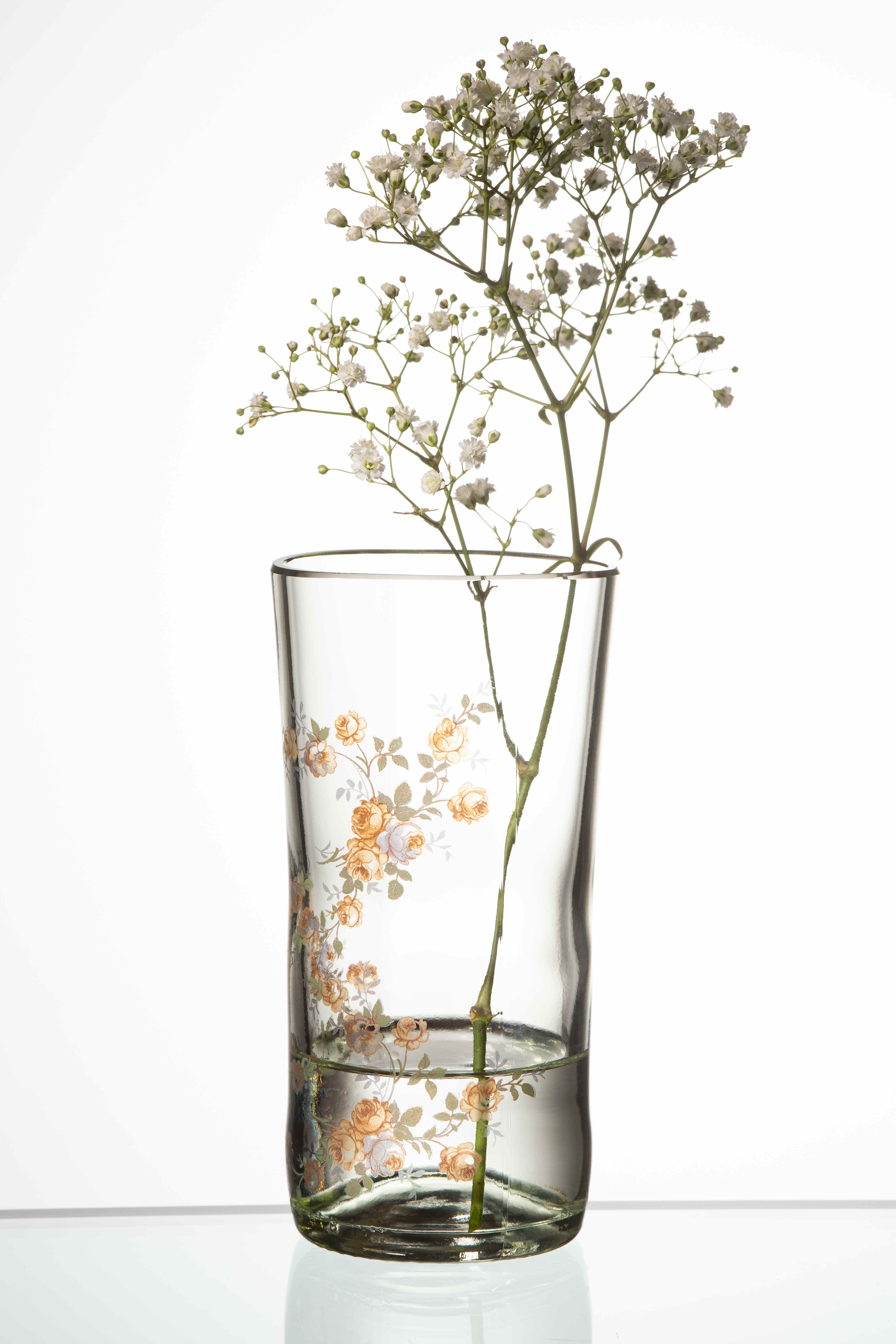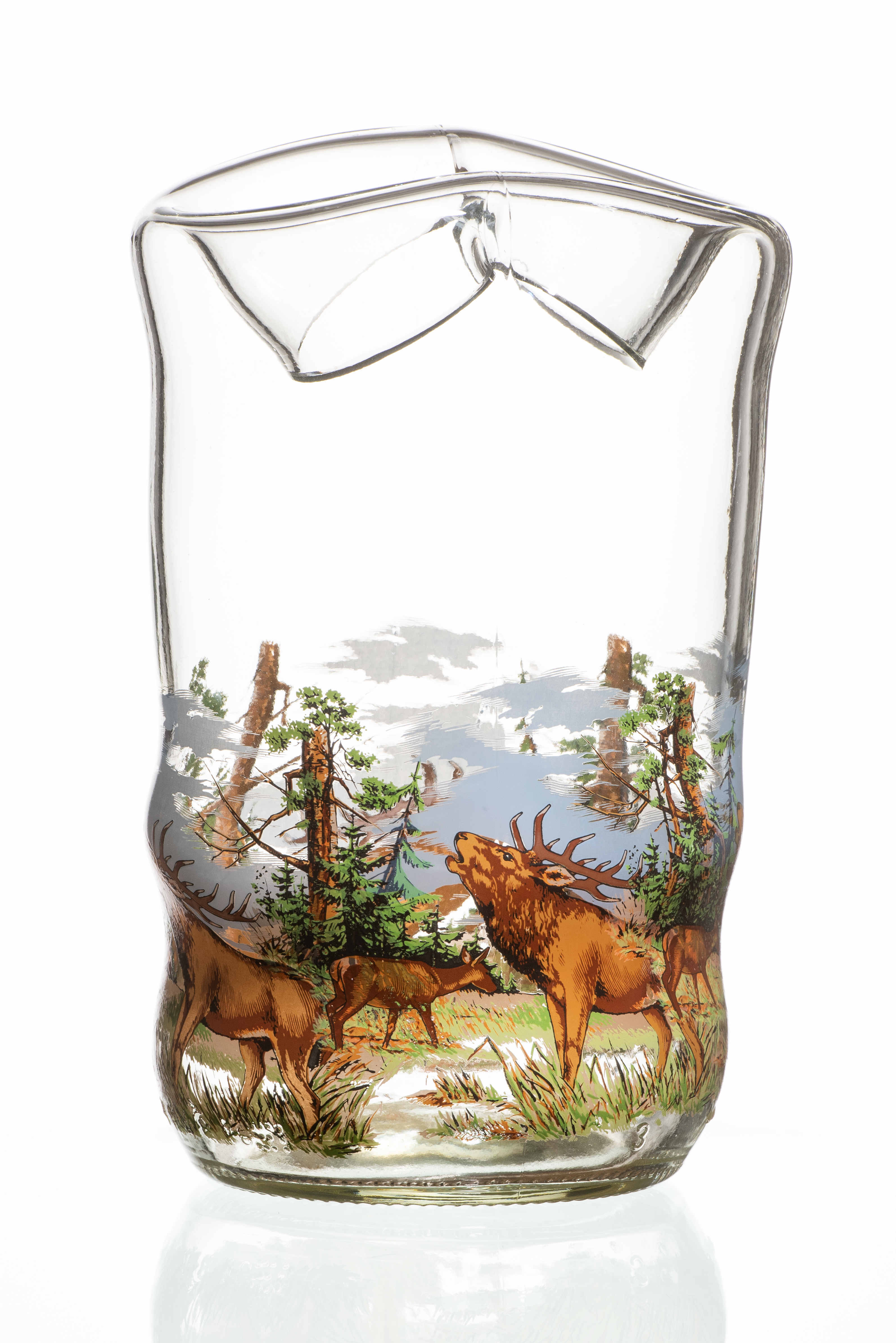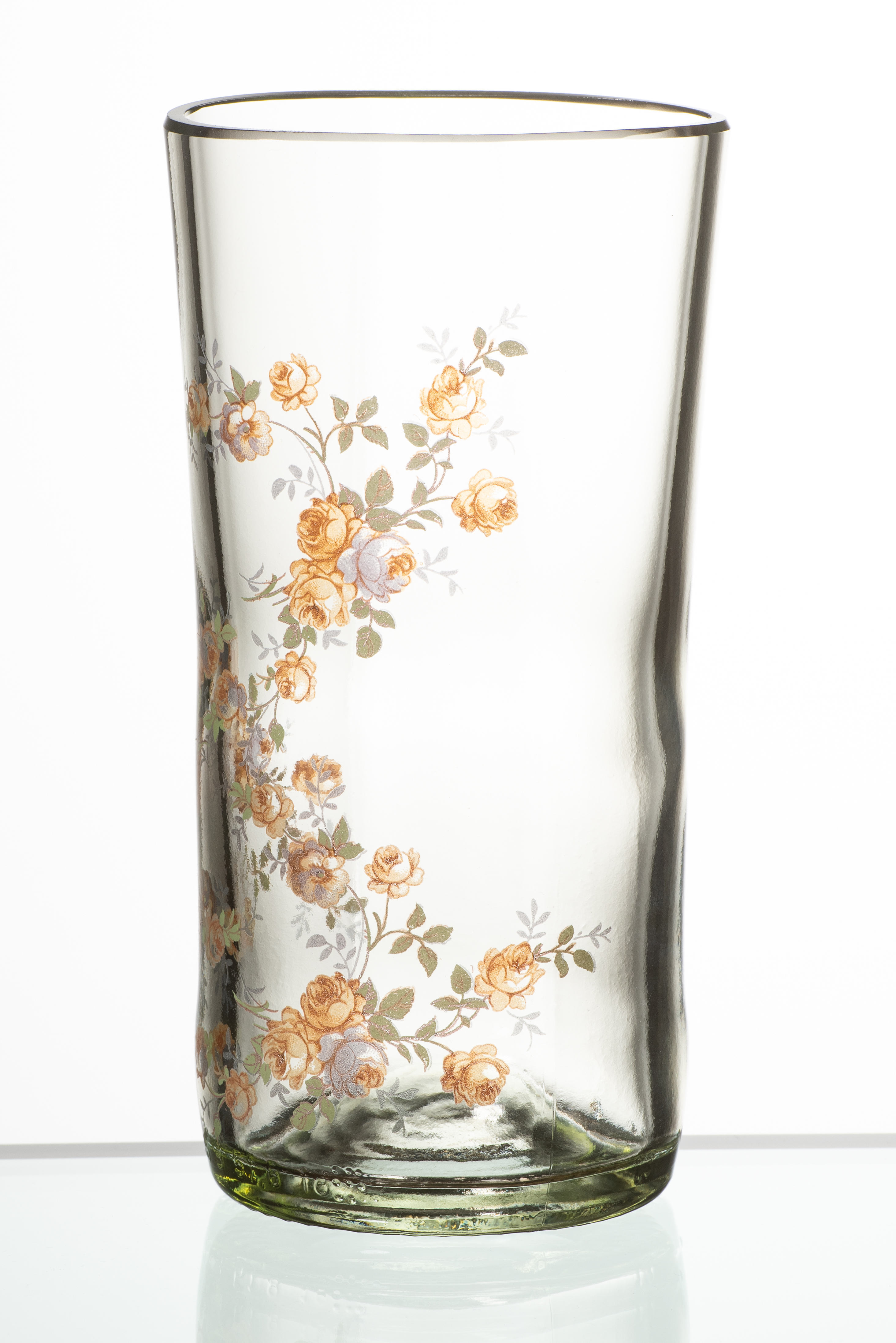 Die Motive werden bei etwa 750° auf die Glasoberfläche eingebrannt, das bringt mit sich, dass sich jedes Glas zum unverwechselbaren Unikat verformt.
